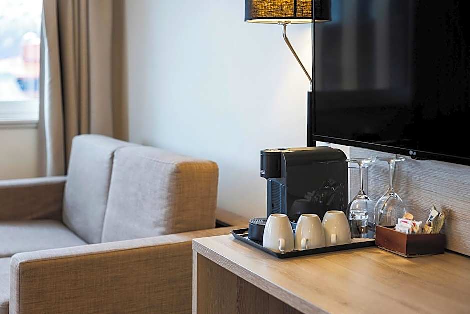 Our charming suite has a separate living room and dining table for six people. The floor is parquet. In addition to comfortable beds, the room has a 42" flat screen TV, refrigerator, iron with ironing board. If you need to work while you are with us, you will find a desk with a chair. The room has a coffee machine, so you can make yourself a cup of coffee or tea. When you live here you can enjoy the view of the mountains and the city.The bathroom has its own sauna.